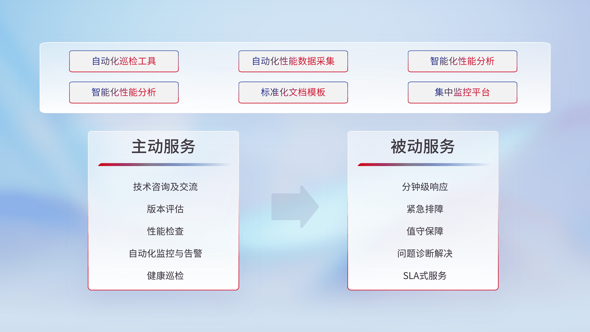 智能化工具和标准化文档,,保障服务质量,,,提供主动服务(包含技术咨询、、、版本评估、、性能检查、、、、自动化监控与告警、、、健康巡检)和被动服务包含(分钟级响应、、紧急排障、、值守保障、、问题诊断解决、、、、SLA服务)。。。。